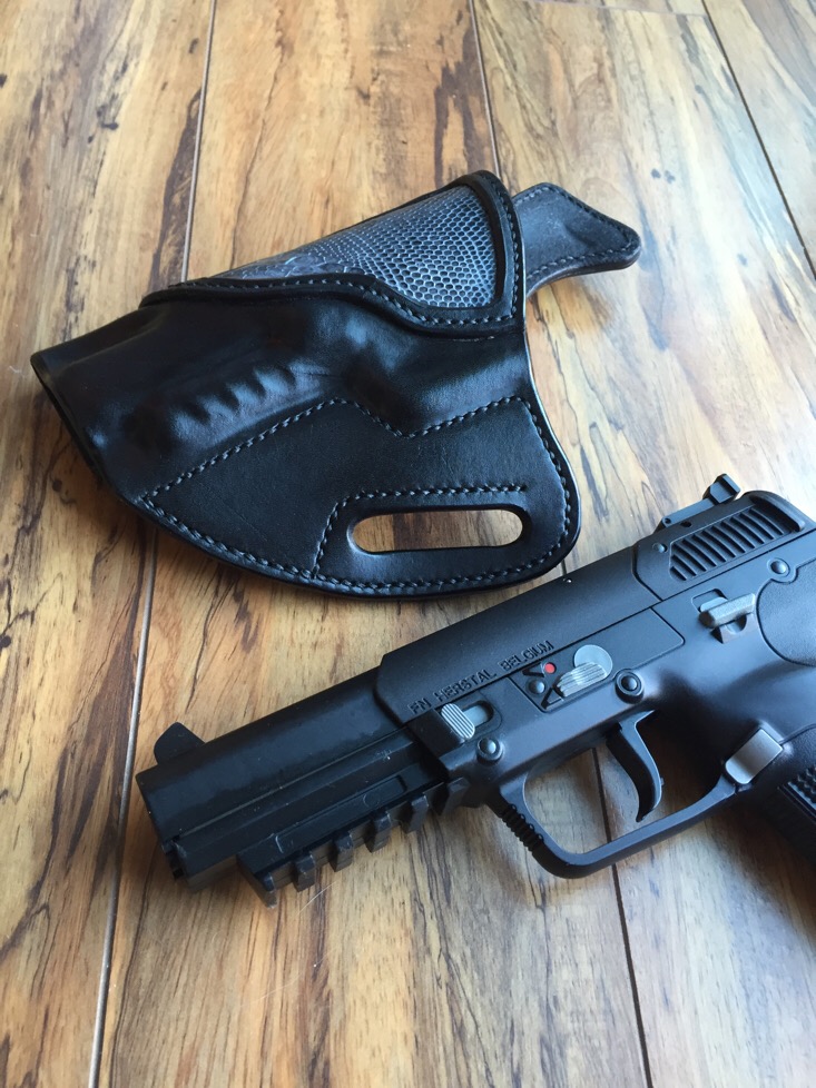Left handed holster for FNH Five-Seven. Saddle stitched with gray lizard inlays. Thanks to JLS Leather for giving me a place to start on this style of holster (this was modified from his free 1911 pattern).