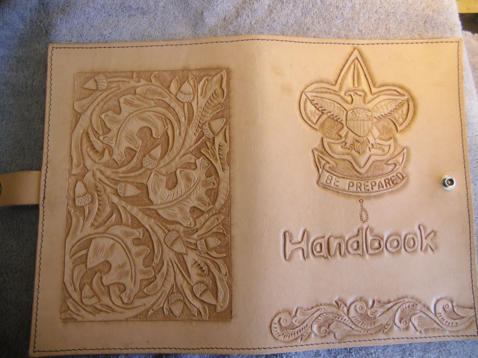 BSA handbook cover made for a troop. Troop members donates money to the troop and I finish the cover with the Scouts name and dye. Scout has oppurtunity to apply the dye. Troop buys me a new cover from the Scout shop. Currently about $25 with tax.