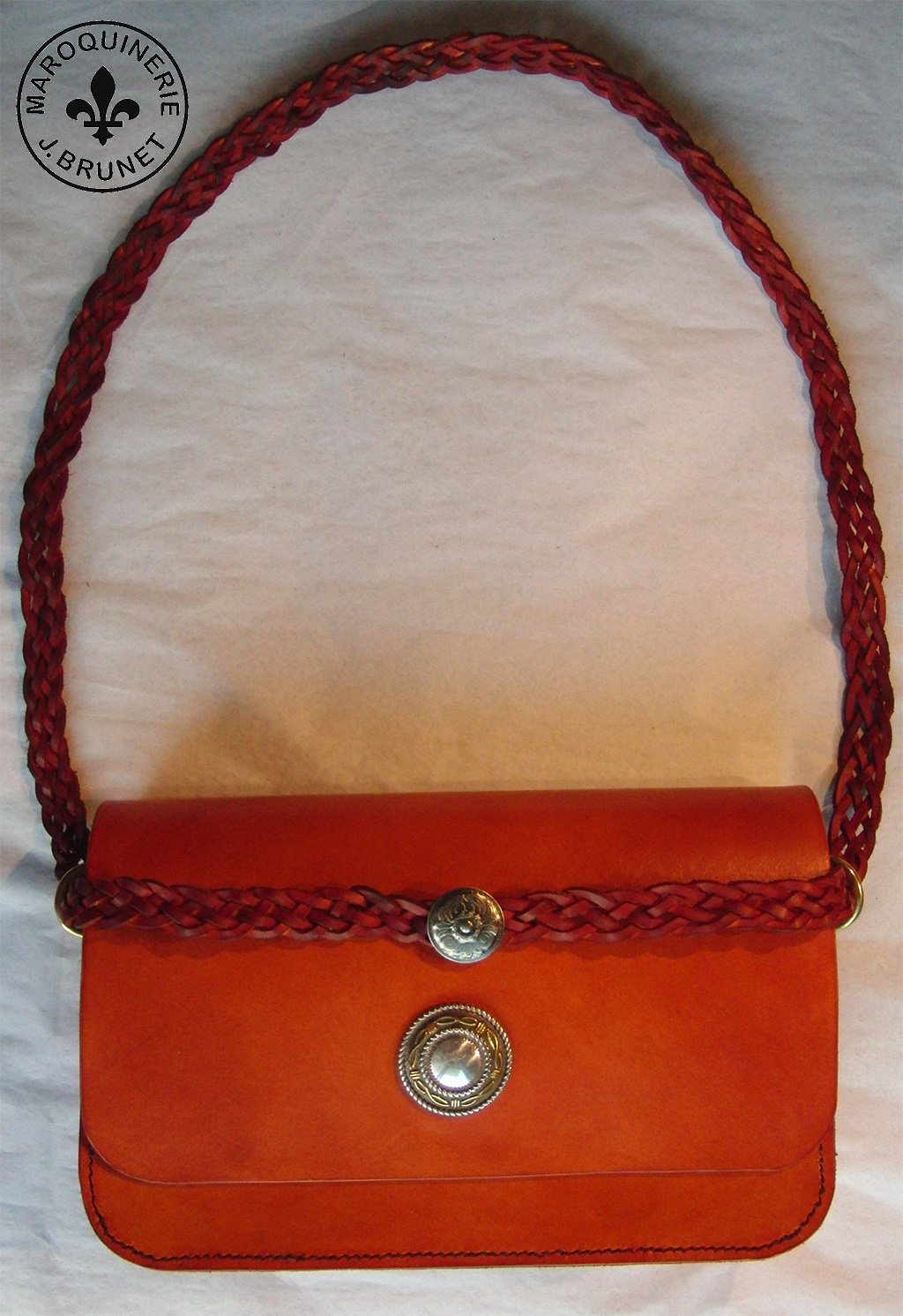 Hand crafted and stitched orange leather designer bag with blue pigskin suede lining. Configurable hand woven strap for hand/arm or shoulder carry. Main flap has a magnetic retention and secondary flap uses a snap. Solid brass D-rings, silver and gold angelfire concho on front flap and steel Diablo concho on strap.