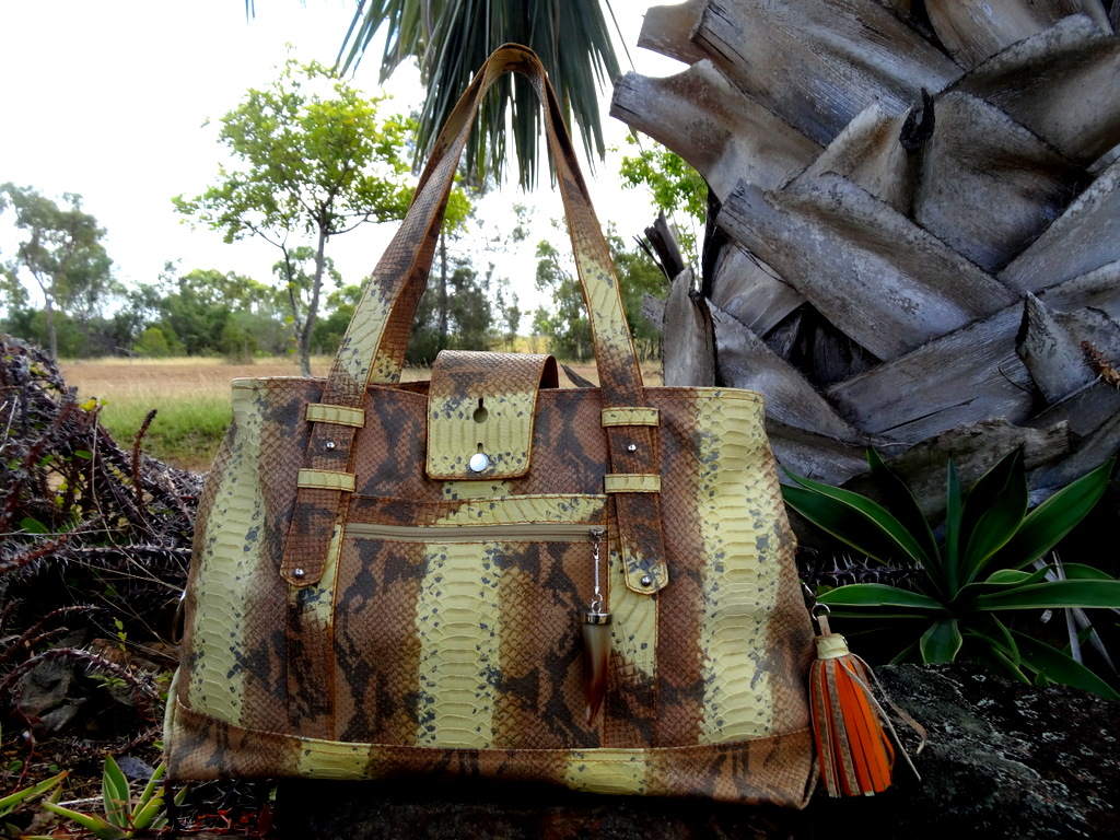 This tote is made up of snake printed cow hide at our Etna Creek workshop in Queensland Australia.
