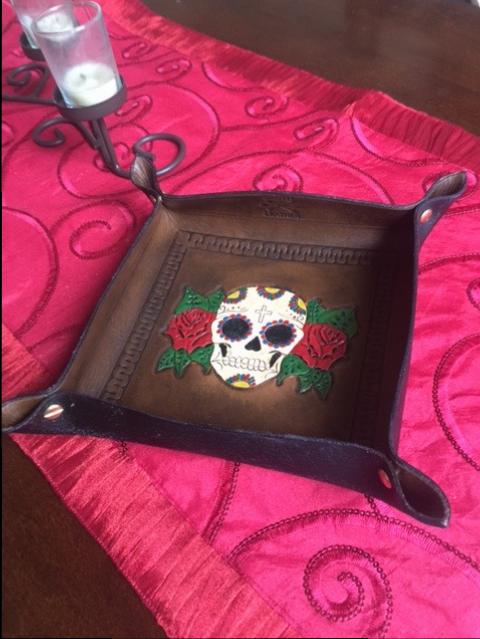 He we have a 7x7 desk valet made from 6oz vegtan. I used a meandering boarder with an acrylic painted sugar skull. I used ecoflo medium brown antique for the color. Nothing special about the construction, just four chicago screws in each corner