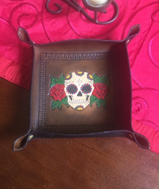 He we have a 7x7 desk valet made from 6oz vegtan. I used a meandering boarder with an acrylic painted sugar skull. I used ecoflo medium brown antique for the color. Nothing special about the construction, just four chicago screws in each corner