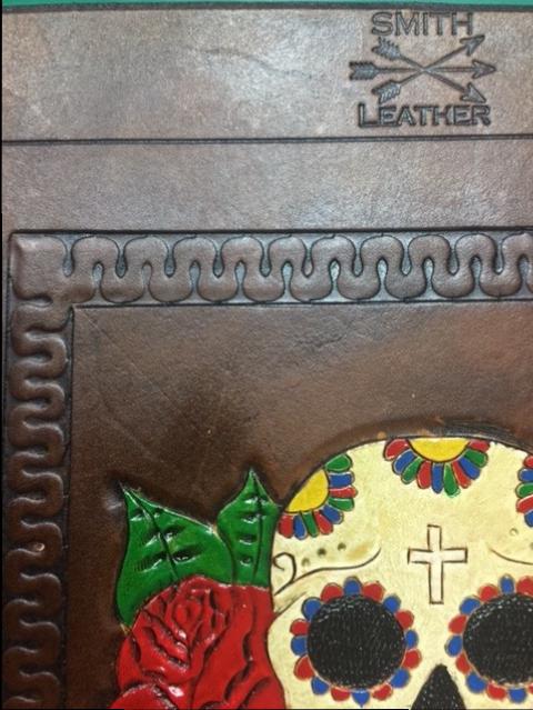 He we have a 7x7 desk valet made from 6oz vegtan. I used a meandering boarder with an acrylic painted sugar skull. I used ecoflo medium brown antique for the color. Nothing special about the construction, just four chicago screws in each corner