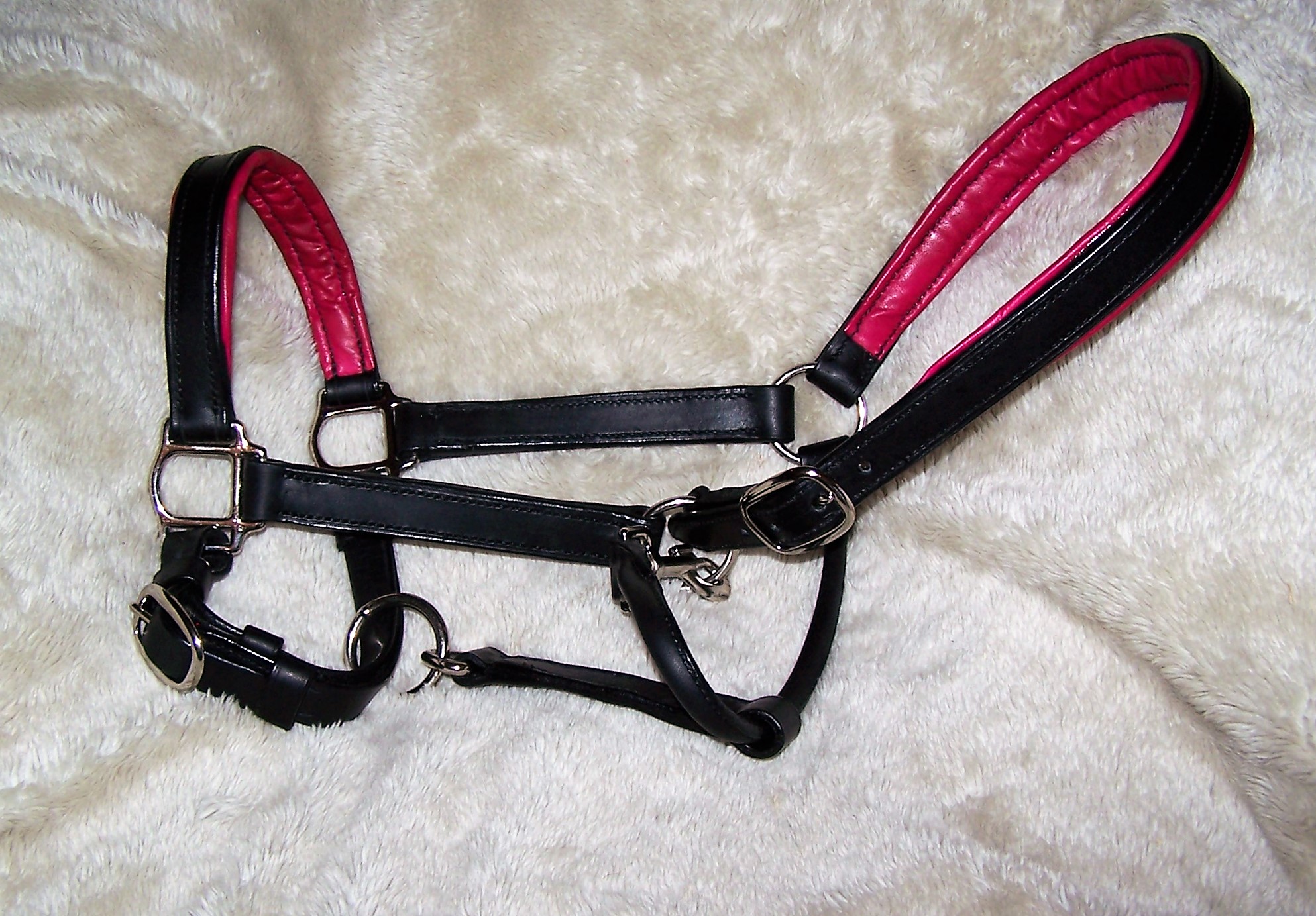 Halter, norwegian bridle leather, dyed pink goat leather, padded with wool.