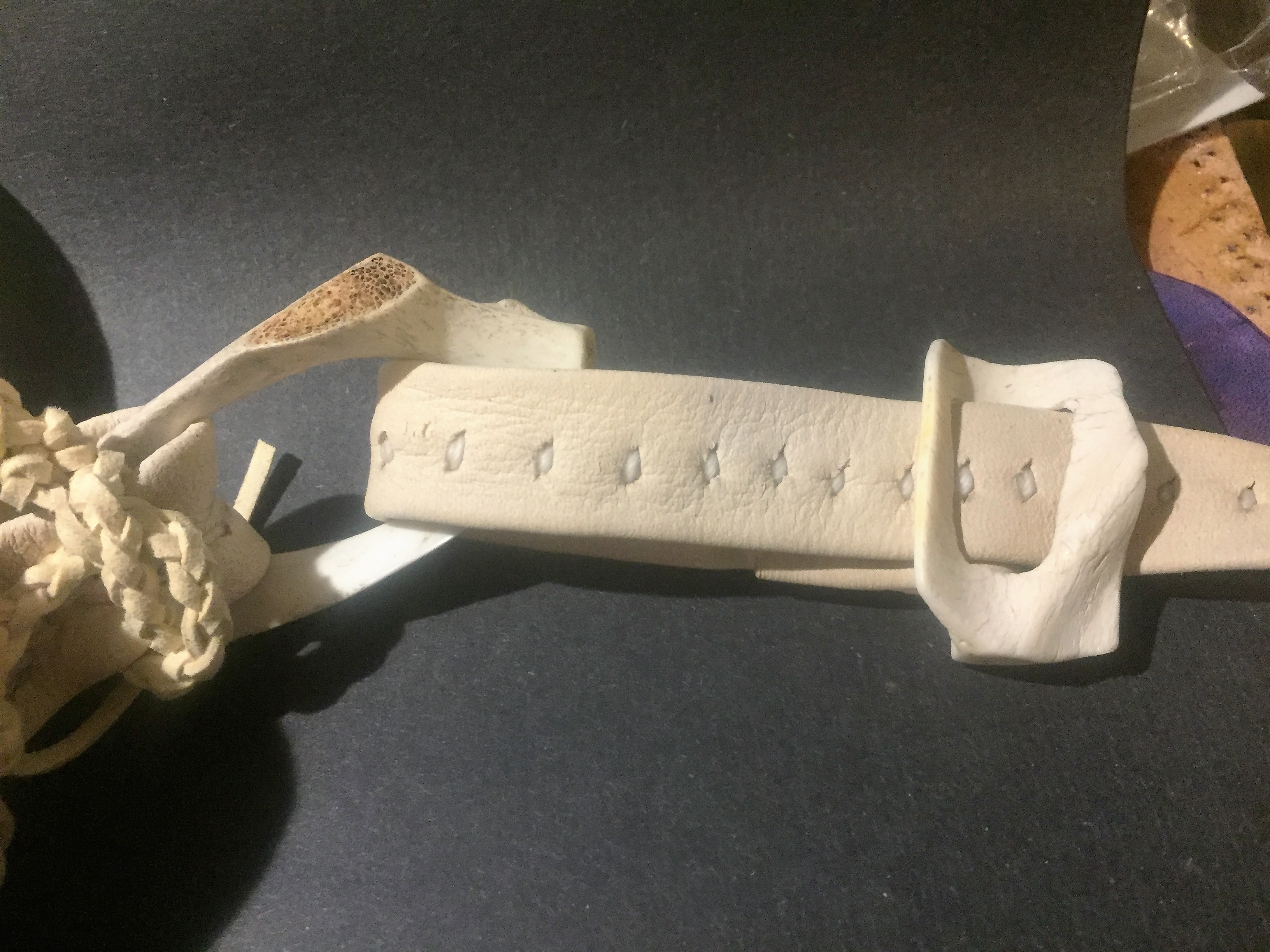 I went hiking out int he desert and stumbled across the remains of a mountain lion's lunch that had been there for quite some time. I took the majority of the bones and processed them at home. I made this "strap ring" from part of the scapula.