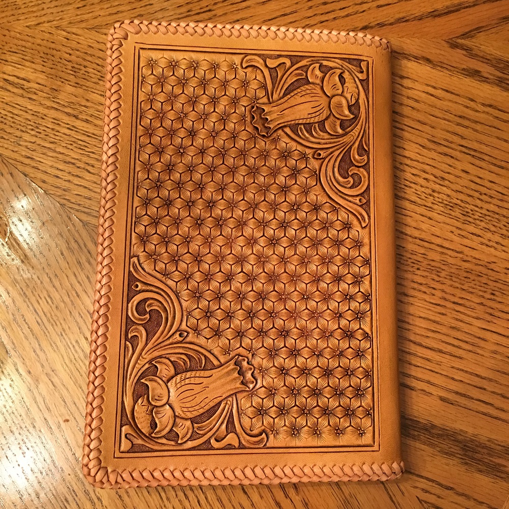 The back of the notebook with floral carved corners and a cool geometric stamp across the middle.