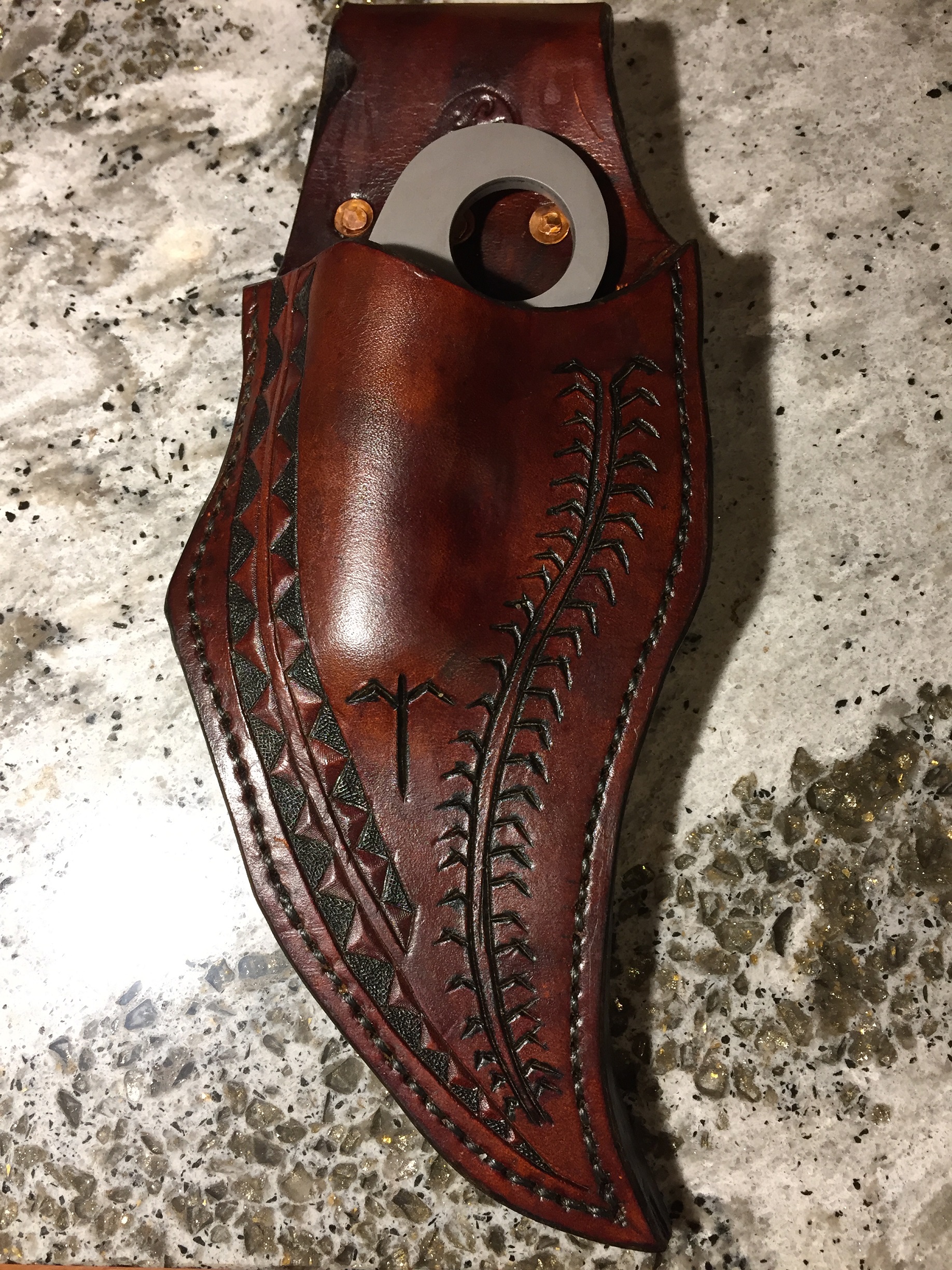 This was a difficult build for me that didn't come out as smoothly as I wanted. The tooling I feel is my personal best, but where it didn't work out well is in the putting the knife back in the sheath. Big honking handle for a big honking hand. I am not a fan of snaps/straps on my sheaths and prefer friction fit. I may have to redo this one and actually use straps.