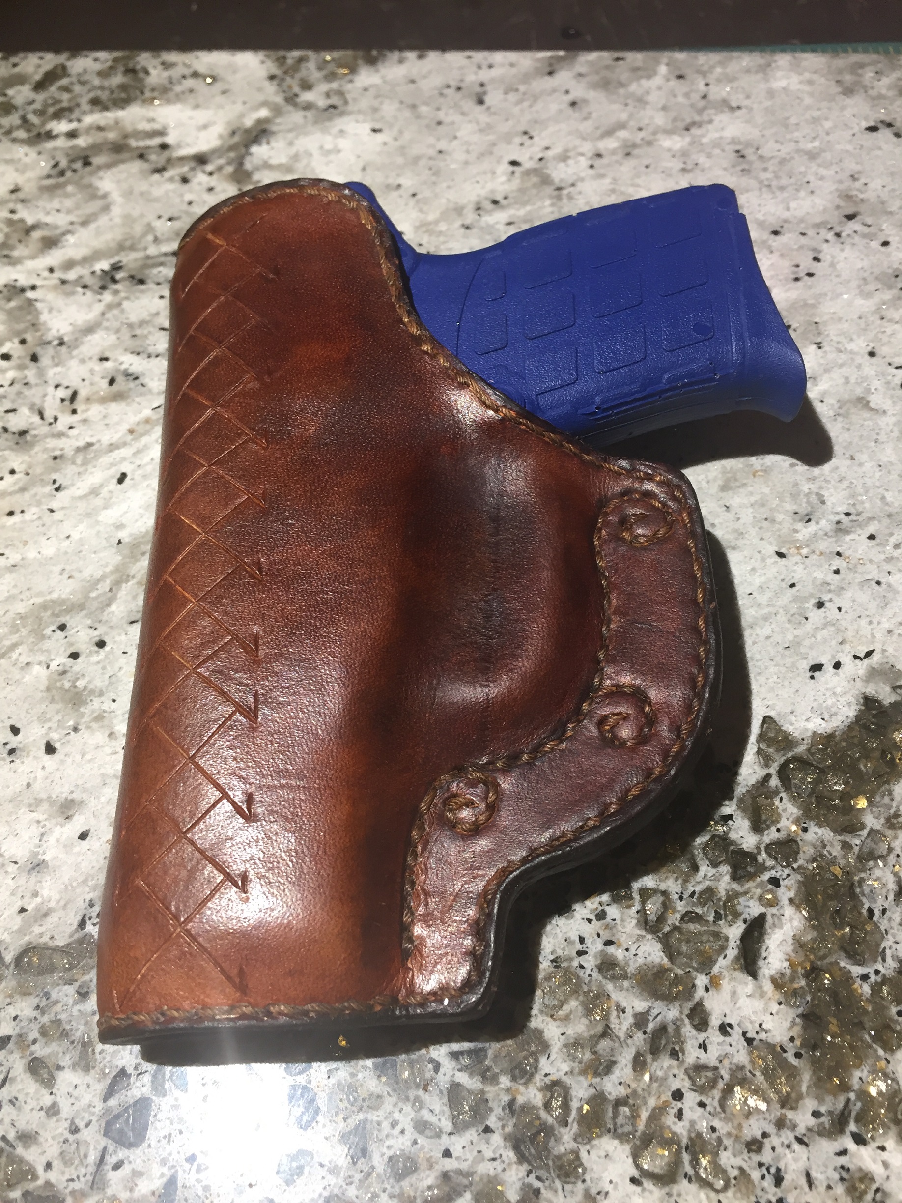 Centipede design (from Filipino tattoos) is swivel knife cut in, Koru (fern spiral design) is made with saddle stitching, copper rivets, friction fit through wet molding process.