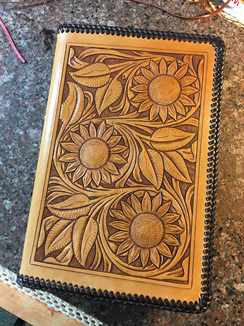 This was the front cover design for a custom designed 5x8 notebook.  The customer wanted a sunflower design similar to what she has on her saddle and I was happy to oblige.  She loved the finished product.