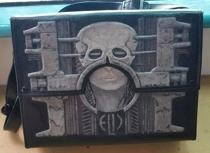 Album cover bag. made recently and taken on board this year's "Cruise to the Edge" - autograph collecting (another of my interests) Solid 2 layer sculptured plugs ... ~ 1.5mm top leather... turn back edges .. hand stitched... black oil dye (plus commercial black refinish) Colour - acrylics .. resolene sealer plus wax sealer .. Inner supports - 3mm hardboard with soft liners ... simple shoulder strap.. line snap closures (least obtrusive fitting - which did work well). Nb : also Posted on FB
