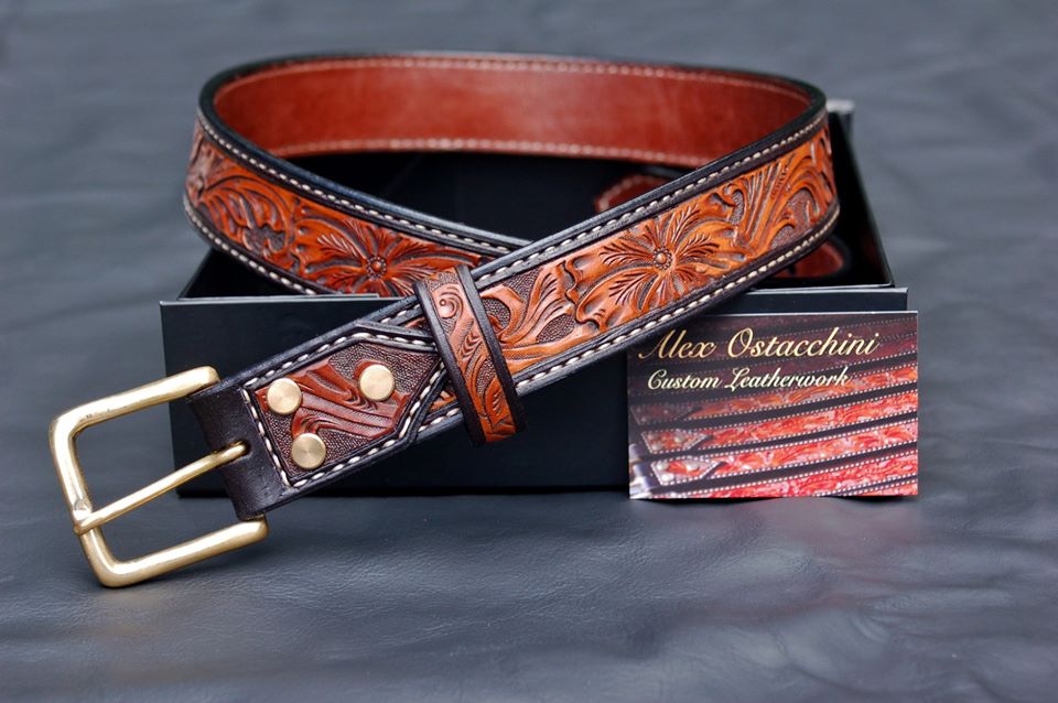 Western style belt, hand tooled, hand stitched, lined, with brass hardware