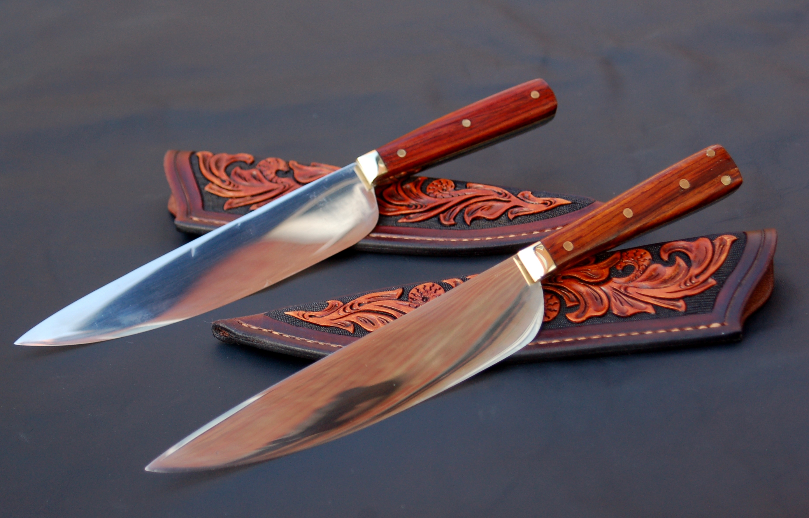 Hand forged chef's knives with cocobolo handles and tooled sheaths