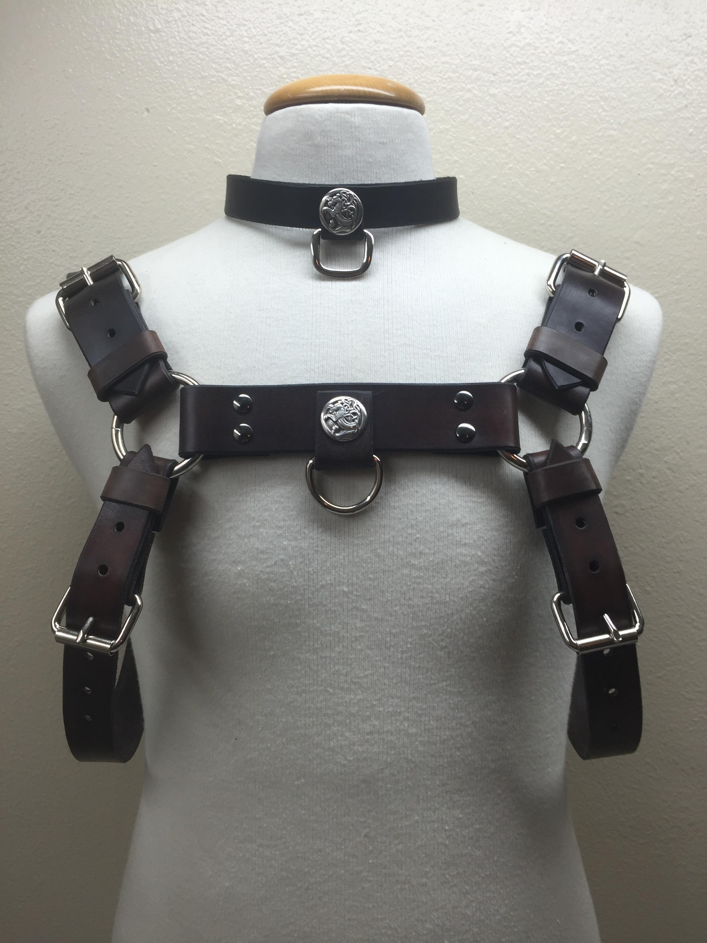 Harness and matching collar for a friend. All made from 8-9 oz veg-tan leather, hand-dyed with Medium Brown Fiebing's Pro Dye and oiled with Neatsfoot. Topcoated with Resolene.
