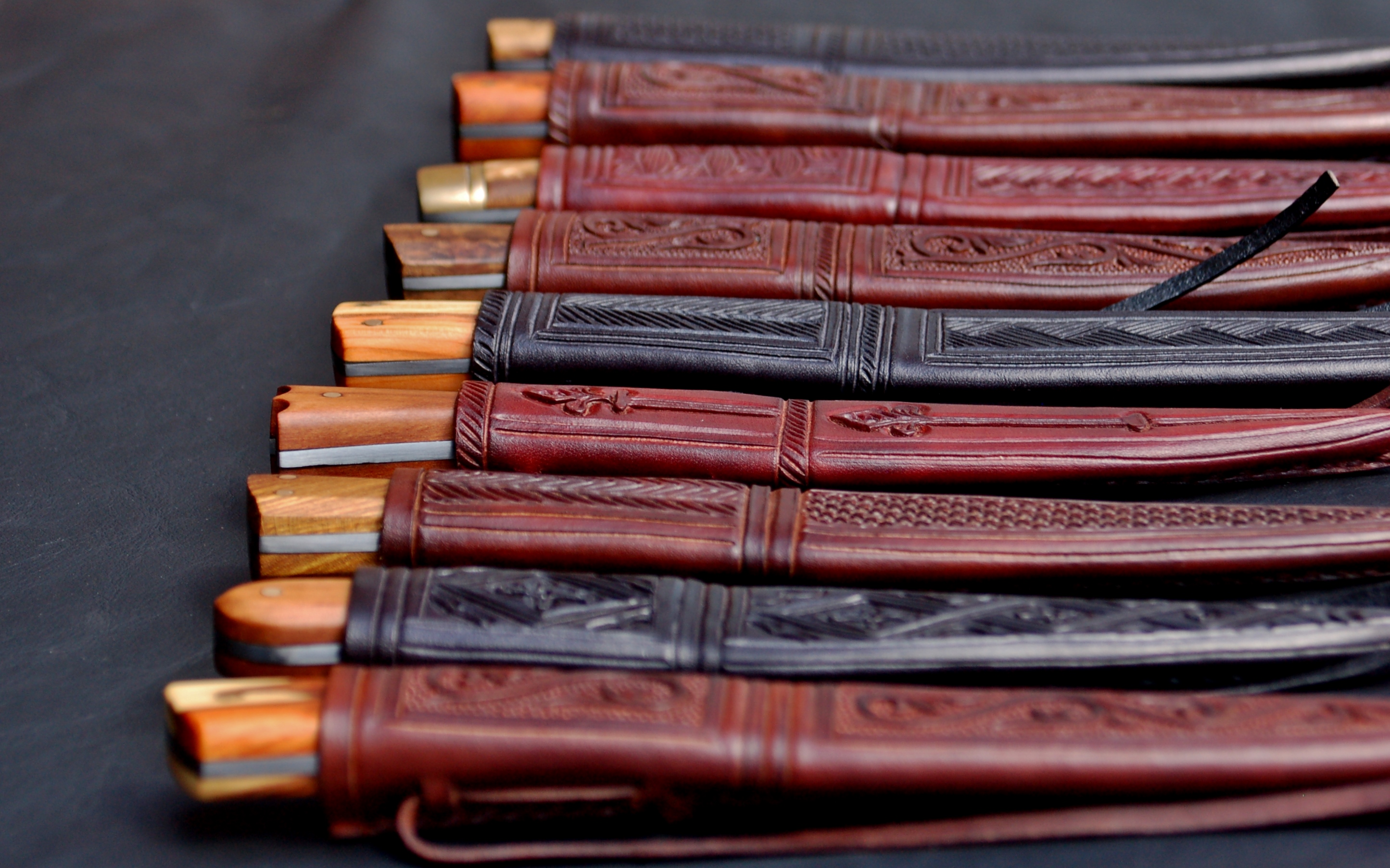 A batch of knives with tooled sheaths based off existing pieces from the Museum of London