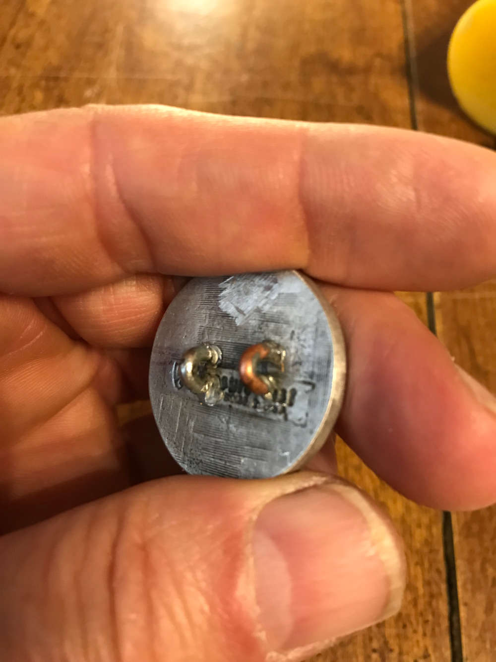 Had to get into a little metal work to get the front closure pin attached to the front flap. The pin came with a single straight pin on the back. I cut that off with a dremel tool and sanded it smooth and then I had to come up with a plan to get a solid fastener attached to the back.  First I tried two sewing eyes.  That didn't work very well.  For one thing the solder joints were not very strong and it took me multiple attempts at the soldering job.  And then when I got them on fairly solid, the sewing thread plan was not premium.  It allowed to much movement of the pin, twisting wise.