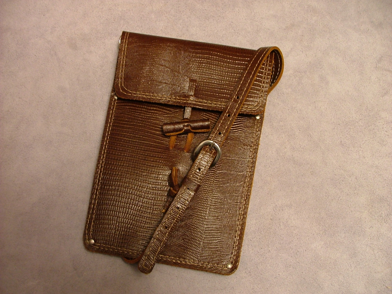 This pouch is made of 6 oz leather and lined with 1 oz. It is made to carry a passport or other essentials while traveling.
