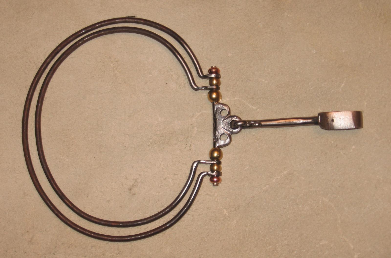Probably not to scale- outer ring is about 6" across the widest point. Outside diameter is about 14" overall. Rings of 1/8" round stock, beads in brass and copper- again from my "oddities" drawer. Based on a find detailed in "Purses in Pieces" by Olaf Goubitz. Page 51, I believe...