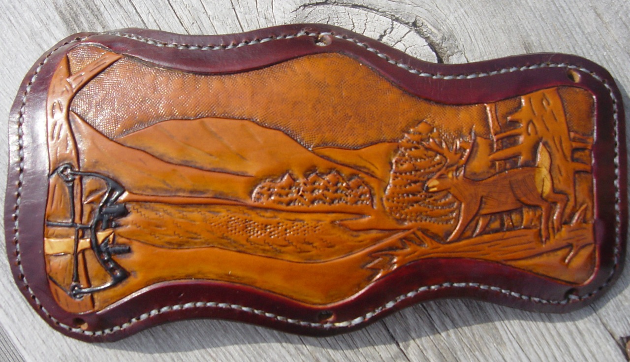 My sister just got a new bow and after bruising her arm up decided an arm guard would be a good idea. She sent me a picture of the plain one she bought and I thought I would surprise her with this. The bow and arm is actually from a picture she sent me of her shooting her new bow. The stitching actually pulled a little more curve into it, which should make for a good fit. The other picture is before the stitching.