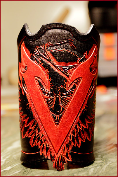 Bracer made for frontman Teddy Möller of LOCH VOSTOK. Design was totally up to me so I used their signature V in the foreground and added wings and a demonic face in the background. This is blockdyeing with a twist. True blockdyeing would have made the V black so had to go with a brush and do some fine brushing with the black dye inside the V and the demonic face.