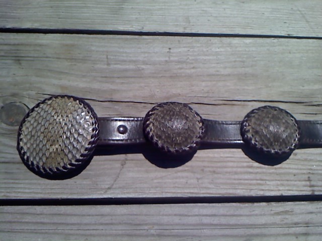 Western Diamond back rattlesnake concho belt. I made the conchos out of 2 1/2" nickle rounds and soldered concho straps on back. the 3 1/2 buckle was made out of 16 gauge brass and concaved and a belt strap and hook soldered on the back. Has a 2 1/2 oz leather back and calf lace done in a double loop style.