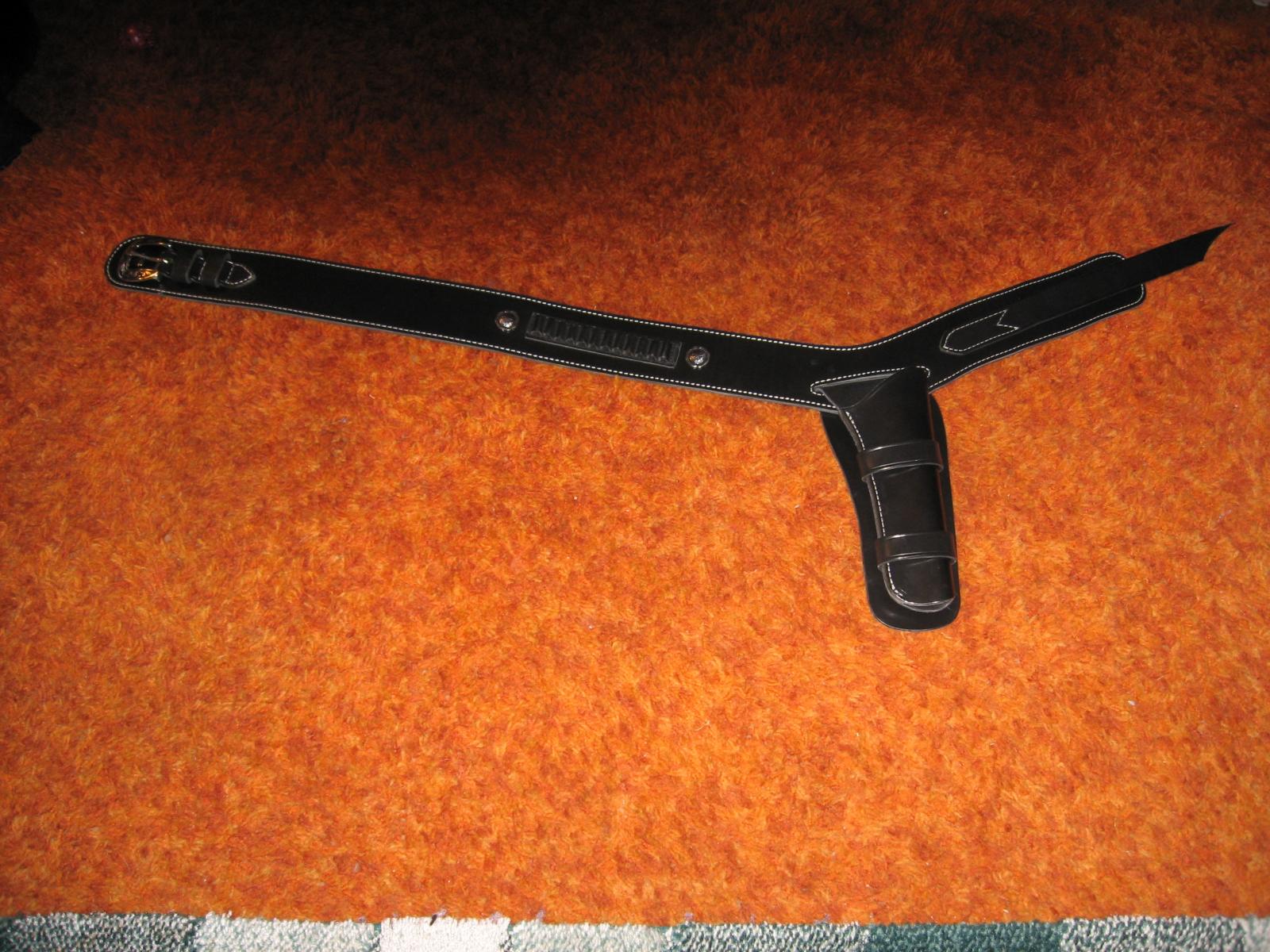 This is a Western style drop loop gunbelt and holster for a single action revolver. It was cut by hand from 10 oz black dye struck leather obtained from Siegel Leather of California. The belt is lined with thin black garment leather. The billet end was not cut as it will be sized to the customer upon delivery. The holster has a center filler along the outside edge. It is approximately 1/2" thick along the outside edge.