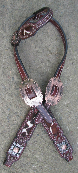 Dark mahogany leather with inlaid giraffe print hair on cowhide. Antique copper dots, buckles and conchos.
