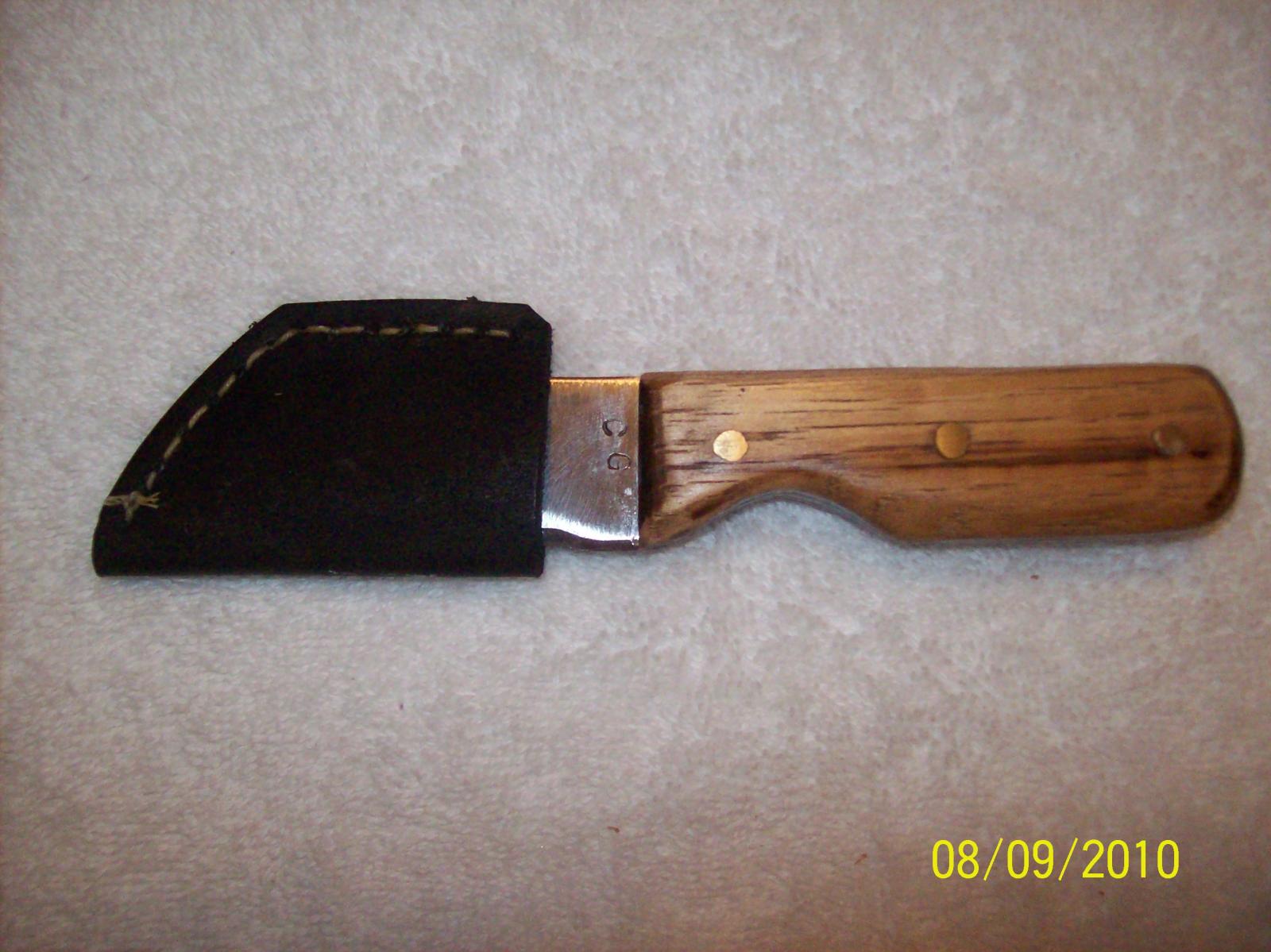 Here is proof that I can actually join leather without rivets. A blacksmith buddy made the knife for me from saw steel. To protect the edge in my tool drawer I made this cover.