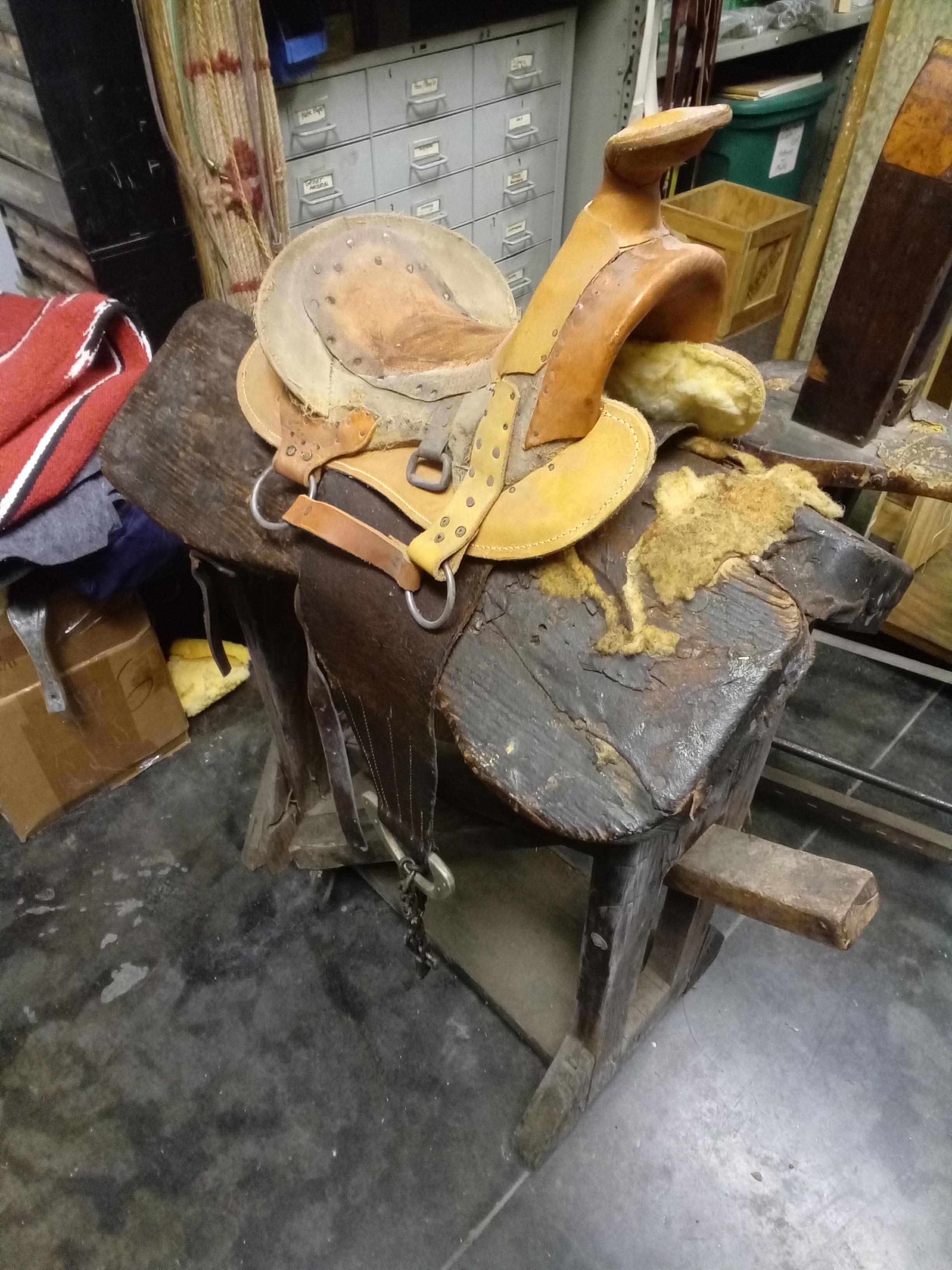 I'm going to do some digging and see if we have a set of oxbow stirrups in our collection that fit with this saddle. If so, I'll make a pair of simple stirup leathers to hang them (not permanent of course, but I'll try to color match them to the rest of the leather). I'm thinking about moving this saddle from the shelf it's been on to a saddle stand, as that would allow the rigging straps to hang more naturally. My mom has a few Navajo blankets/rugs that need to get out of her closet that I think one would fit in with the display as a saddle blanket.