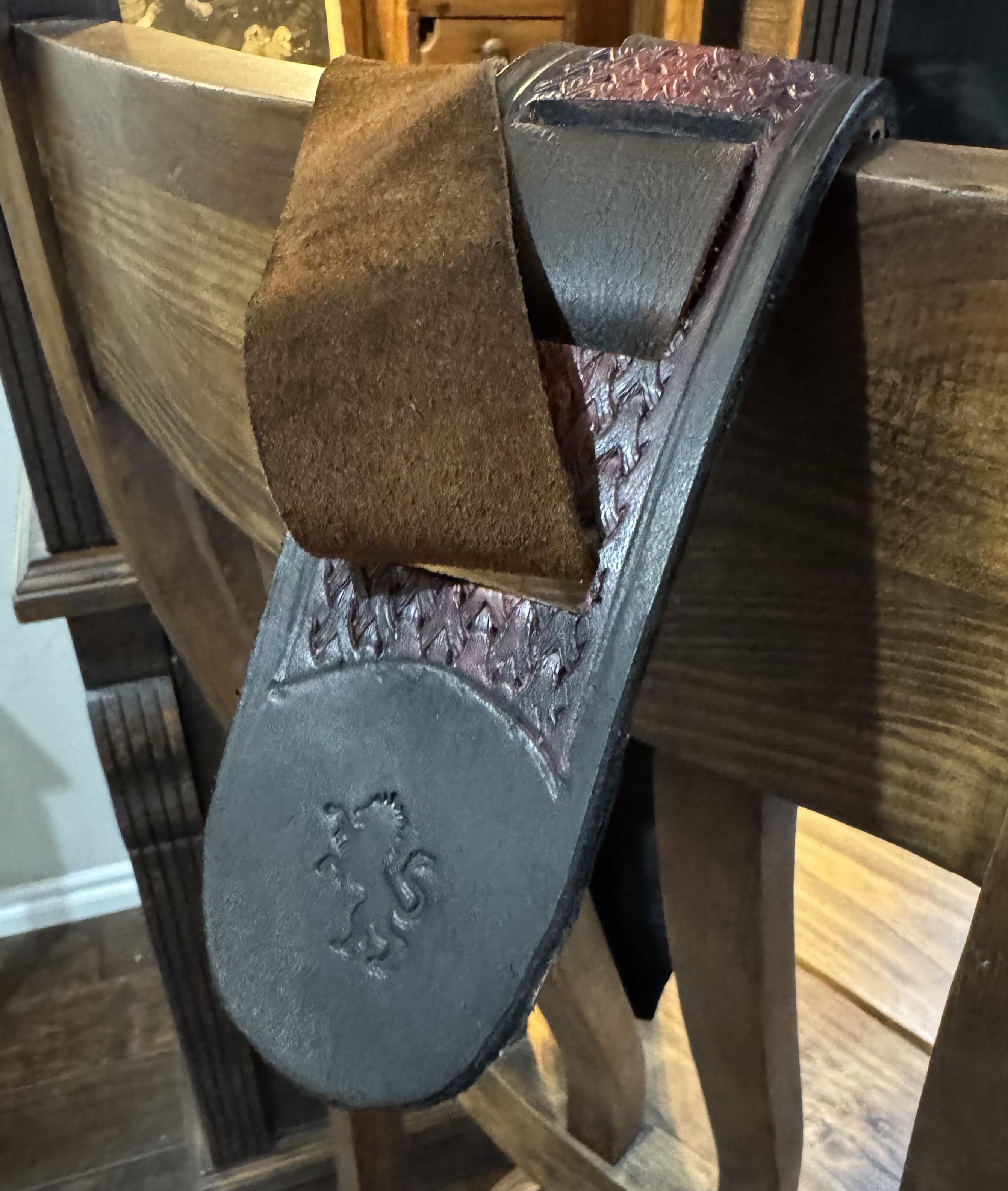 I hate lining letters. But this customer wanted a very "aged" or "ancient" look soooo. that's what he got.. The strap was going to be 3" which made my pattern lay out better, but then they decided they wanted to narrow the strap to make it a little more comfortable. I had a difficult time with reducing the patterns without muddling them. I actually bought a Celtic knot stamp from Belgium to border this strap, that that stamp was difficult to line up and looked terrible, so I went to the tri weave. -