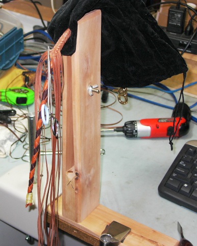 I have an update on the progression of the braided dog leash I been workin on. Here be the photos of it so far. I know you can't see it to well because of the braiding post. But the braid got too long to continue with it off the hook. I did more on it after I took the photo. So, I'm a little bit closer to bein done with the long part of the braid. Still tryin to decide on what type of handle I want to put on there, or if I just want to continue with a straight braided handle. Brian...