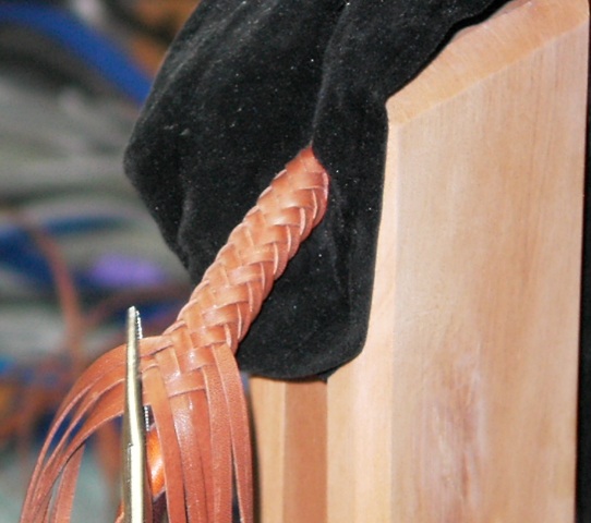 I had some scrap roo lace settin around. I just cut it even to the length I needed. Then I grabbed me a brass latch that I liked from home depot about $1.39 or somethin like that. Then I took the scrap, middled the 2 scrap strands on the latch and did a 4 strand round braid for just about the entire length of the scrap and then lashed it off at the end. That completed the core. I used the scrap roo because it is very strong. Since this is a free gift to a friend of mine, I used smooth calf skin lace from tandy to do the braided leash. But since his dog is not a show dog, I did not need to use roo lace. Actually, the braid is very simple once you have it started. It's an over 2, under 2 sequence. So, the actual part of keeping track of the strands is fairly easy. All it takes is a bit of patience, and taking your time with it and not rushing it. I know that one time in the braid, I got in a hurry with it and crossed one strand on the back side of the braid and did not notice it for about 2 cycles of braiding. Had to take what I had done apart up to the point of where I messed up and redo the rest from there. So ya see, don't be in a hurry to get it done. Speed comes with time and practice. The best advice I can give you right now is this; Never be intimidated by what you see. I did not get where I'm at with braiding and knot tying by being intimidated by what I saw others doing. I simply just jumped in with both feet and now I'm totally hooked to braiding. It also helps to have really great mentors who watch and teach you along the way. I have a really great braiding mentor. He has taught me more about braiding in a year, than what I have learned on my own in the last 15yrs of knot tying. He keeps me in check with my skills and reminds me with his own braiding that I'm still learning. Brian...