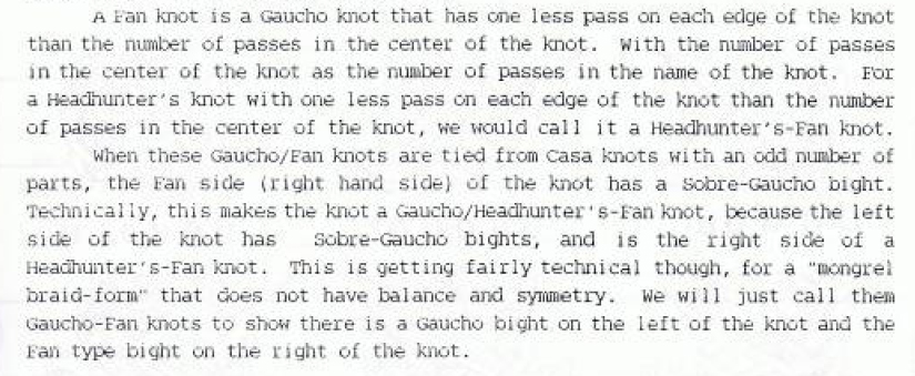 A 5 part 4 bight base knot - 4 bight is divisible twice. A 7 part 6 bight base knot - 6 bights is divisible 3 times. A single string version of the gaucho will work on the second one quite well. Gauchos are dependent on the bights being of an even number or the numbers being of an even type value. I have only encountered this once or twice and only because my braiding mentor brought it to my attention some years ago. So I had conducted a little bit of research into that matter. The 7part 6bight base casa knot seems to be the most popular with this simply because people tend to tie this knot more often than not. It's been some years ago that I worked on this research and the data is some where on one of my hard drives. Of course this will take some digging through about 10 hard drives. Gaucho Knots - Quoted from Tom Hall (Introduction to Turks Heads) page 127 " Gaucho knots are regular cylindrical flat braids with a constant column coding throughout the knot. It must have gaucho bights on each edge of the knot. Gaucho Fan Knots - Again from Tom Hall's book (Introduction to Turks Heads) page 125. I am hoping that this helps out. Brian...