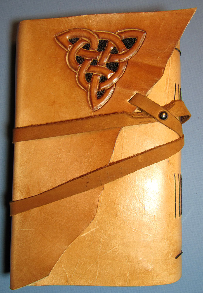 I just finished these two. The first is a small executive portfolio, designed to hold s 5x7 notebook. I used the European tanned leather from Tandy for it. It tools very nicely! After oiling, I applied several thin coats of Acrylic Resolene as resist, then antiqued it with Feibings mahogany antique paste. Finished with two more coats of A-R, then two coats of Tan-Kote. It's sewn with natural colored thread. The second is a sketchbook/journal, made with that really torn up leather I got on sale from Tandy. I tooled in a Celtic knot and then dyed the background. Finished with four coats of Tan-Kote. Hand sewed the paper, Canson 80 pound art paper using a long stitch. It measures 7.5x10 and holds 240 sheets of 6x9 paper. Any critiques are welcome. Dave