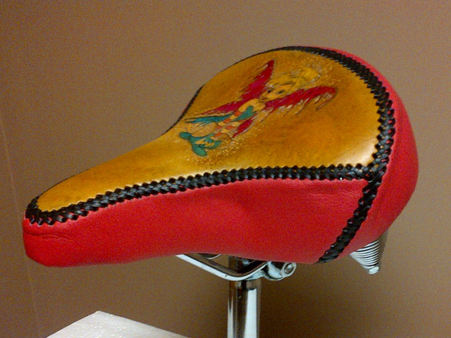 Thanks for the compliments everyone, they are greatly appreciated. Spincycle, No sorry I didn't take pictures of the underside. I took the factory cover off the seat, cut it up on the seam lines and used it as a template. The factory cover was glued to the foam as well as glued and stapled to the underside edge of the seat pan (plastic seat pan), so I just did what the factory did, glued and stapled it. I ran into a bit of trouble, as I couldn't get the spring assembly apart, the carriage bolts just spun in the plastic pan, so the stapling was a bit hard to do, and it caused a few wrinkles to appear on the edges of the pink leather. -