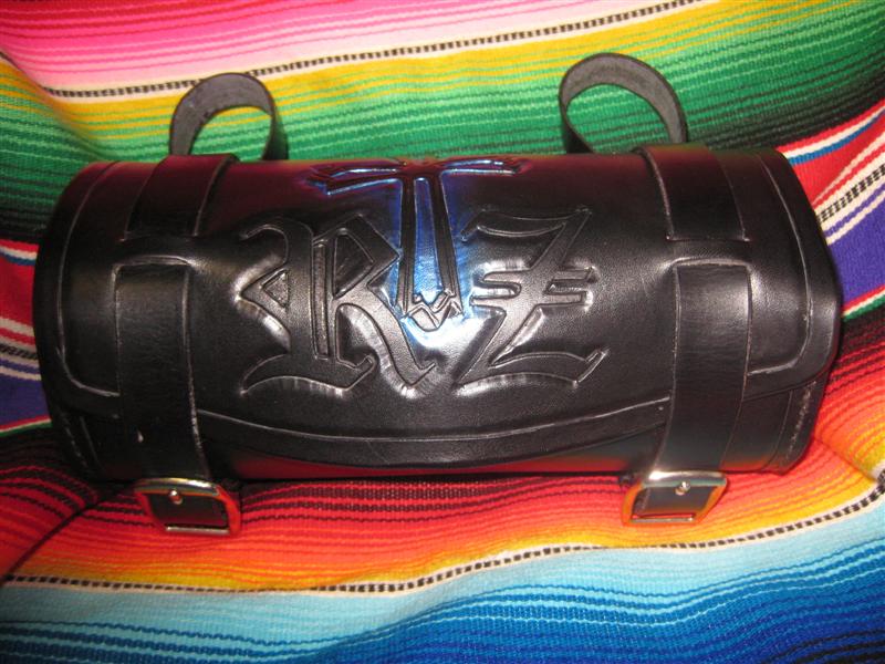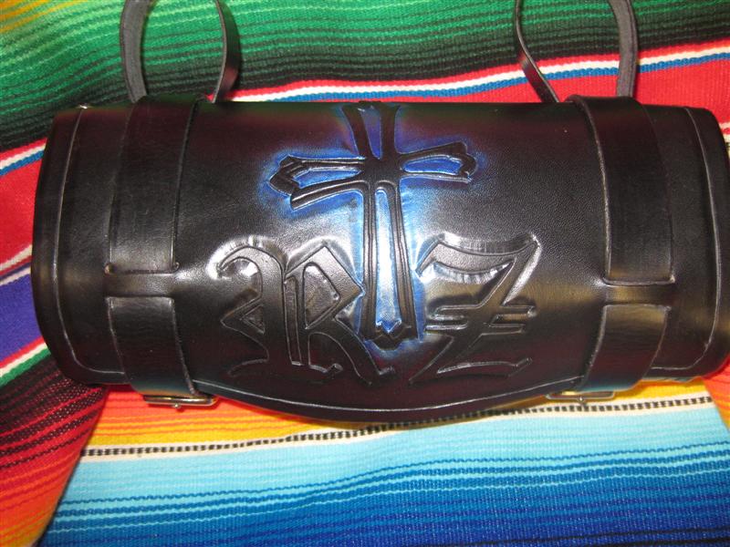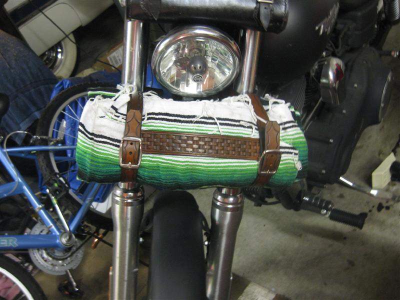 Here is a rig to hold your favorite Serape on your motorcycle. It's 8/9 oz and the fork straps are removable. Tan base dye then antique med brown over and finished with Sno Seal.