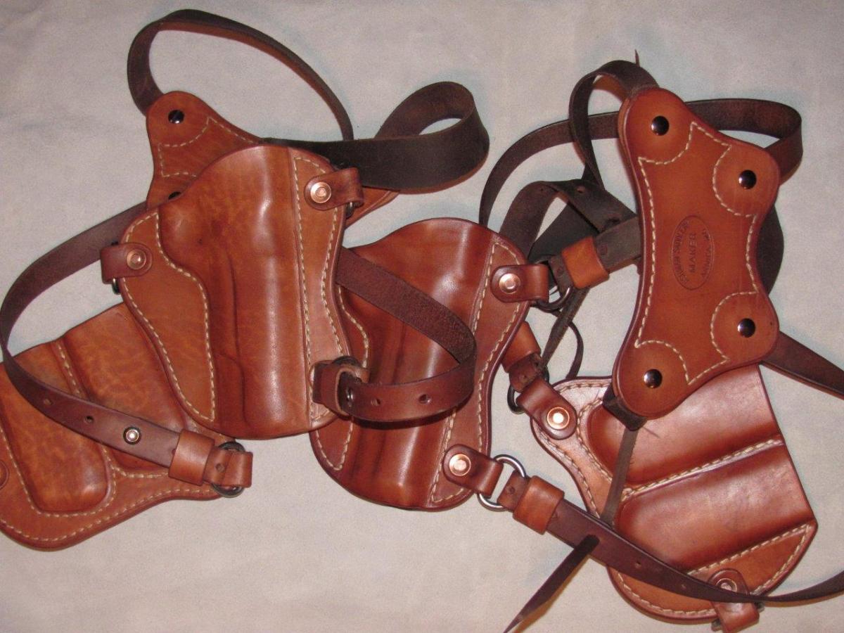 I knocked out these two horsehide shoulder holsters this week. I'm pretty happy with how they both turned out. 6/7 horse butt from SLC, 277 thread, a coat of NF oil and 50/50 M&G followed by a wipe down with glycerin saddle soap. The top straps are made of some oil tan chap leather scrap I had. Let me know what you think, thanks for looking. Josh