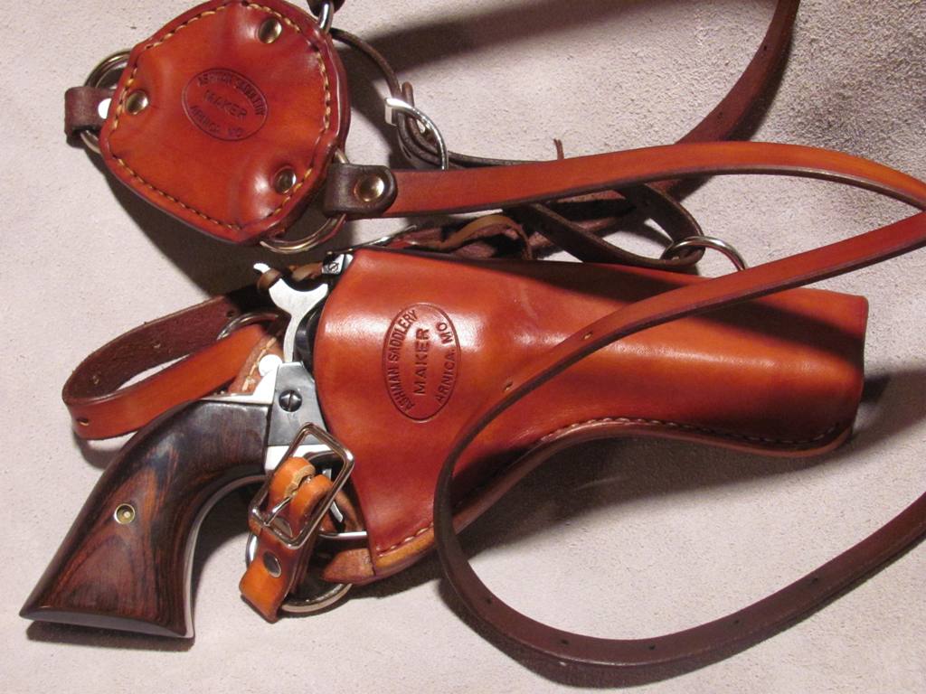 A lot of people like chest holsters which are very handy when horseback or doing about any outdoor activity. They can be built as "cowboy" as a person would like. Here are a few I've made, one for my Ruger Blackhawk and another for a 1911Commander, I've also attached pics of them in use. It'd be easy enough to build something similar for a 92F. These are a simple "envelope" type holster with rings at the top and a D at the bottom, a back plate and some straps. Best regards, Josh