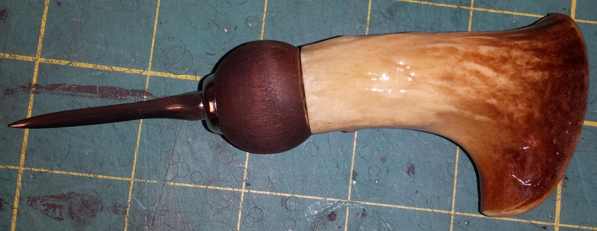 ok so I said I would post a pic of my latest awl it is HSS made out of a 6mm tap and an antler shed. It fits my hand perfectly the haft has a perfect curve to it as well as having a wide base to allow for a firm push. The awl blade has a width of 3.4mm and a thickness of 1.2mm-1.4mm as you can see in the photos the 1st two on the left are commercially purchased blades and the hafts were repurposed bed knobs from an antique bed. the one with a ferrule is 1/2'' copper tubing. I decided not to use the same on my antler haft in stead I used a wood bead to complete the haft along with a SS washer it works and looks ok to me. the 1st photo shows a comparative of the holes the 1st 2 are the commercially purchased blades the 3rd is my hand made one. comments are welcomed!