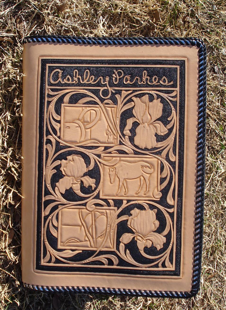 The first one is a guitar strap I made for my friend Sean; the second is a sketchbook cover I made for me; and the third is a purse I made, also for me. The sketchbook cover is background dyed black (and I need to work on my dyeing skills but that's OK), and the purse is filigreed over navy-blue suede.