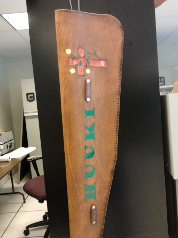 This is a prototype for a bronc halter I glued a clear plastic cover on the inside of the top piece of leather stitched and glued the back on. I left a small slot in the bottom to slip a picture in, it’s held in place with the small star concho. Doug
