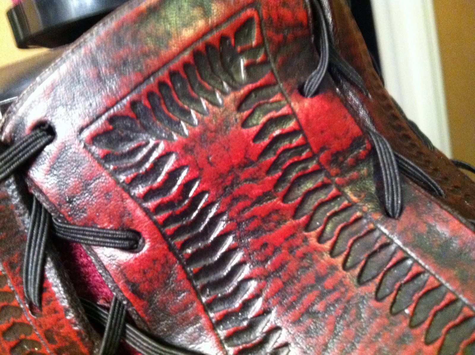 I've been trying to replicate some leather armor I have that was not made by me. It is red (looks tomato or brick red) with black antique finish but I'm assuming more products were used to achieve the look. The only dye that comes close to looking like the red is Eco Flo Cranberry red. The Fiebings red has too much pink. Same with the Oxblood. Also I can't get the antique finish to stay in the tooling. When I wipe the finish off with a cloth everything wipes off and doesn't accumulate in the tooling. My attempts are on the scrap leather, using EcoFlo cranberry red and Fiebings red dye, with both acrylic black leather stain and fiebings antique black finish. I have some red Pro Oil dye arriving in the mail soon which I'm going to try. It doesn't seem like the dye + finish was all that was used to create this look. I'm fairly new to leatherworking and don't have all the dyes and finishes I'd like because I'm not sure what to buy. If anyone could suggest any products or maybe even any suggestions on what to try/experiment to get this finish looking like the pictures that's be great! Thanks in advance.