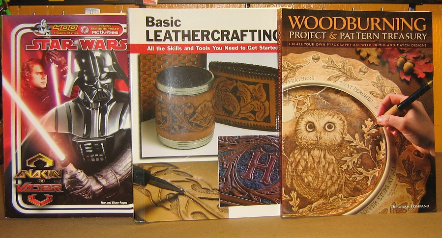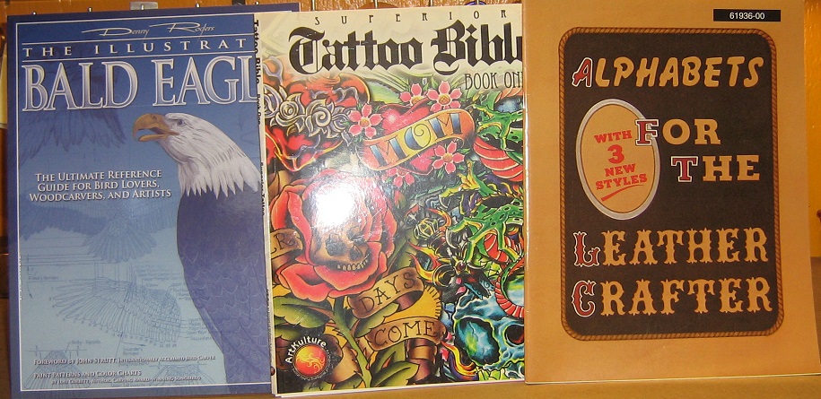 MORE GREAT SELECTIONS FOR THE LEATHER CRAFTER. ANY PACKET AT $20.00 PLUS SHIPPING VIA METHOD YOU PREFER TO USE. PACKET WITH TATOO BIBLE MAY HAVE LOOSE PAGES AS USED AS PATTERNS IN THE PAST, (THE ONE NEXT TO THE DRAGONS COLORING BOOK). I WILL ATTEMPT TO PLACE MORE PATTERNS WITH THE SELCTION IF I CAN LOCATE IN THE SHOP. God Bless. Ray
