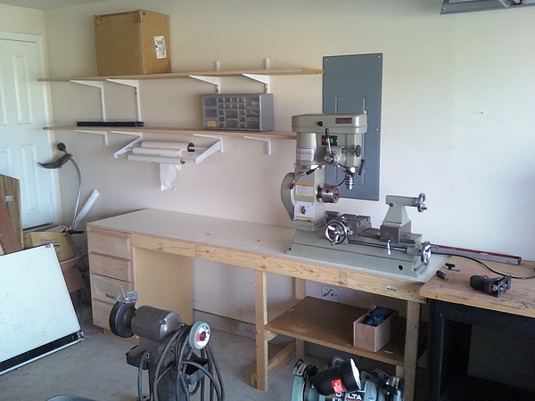 I started on work bench number two this morning. I thought I was done with it, but after looking at the photo I think it needs some more legs in the middle and a shelf under the side across from the drawers. I spent half the morning trying to figure out the layout for the rest of my tables and assorted equipment. I am barely going to have enough room to walk around once I set it all up but it will fit. The space I am using is 18 ft by 16.5 ft and I am using it all up. ClayM.