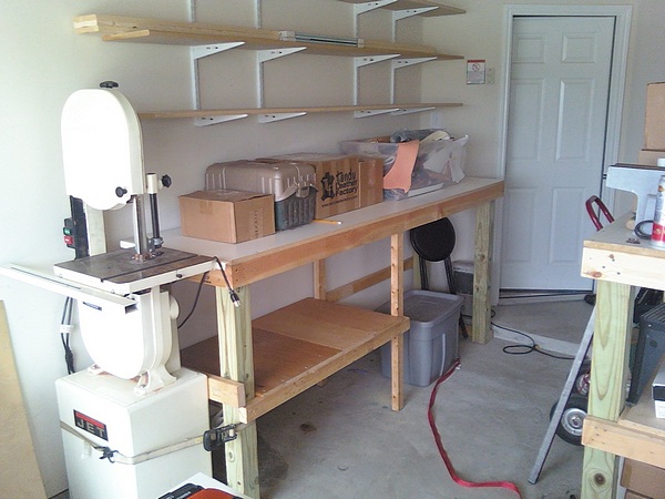 John, Thanks for the suggestion. I have 8- 2x3's supporting the weight of the rock. They run from left to right from the front of the bench and are attached to 2x4's that run from the back to the front. Then to go over kill, I have another 2- 2x4's that scab it all together. I will post a picture of it later this evening. I see your point of adding a little more support to the front edge. Will look at it some more..Thanks I just finished the shelves for the lower protion of the work bench. They came out ok but I had to re-cut one of the shelves to get it to fit. Here is a picture of the bench with shelves added.