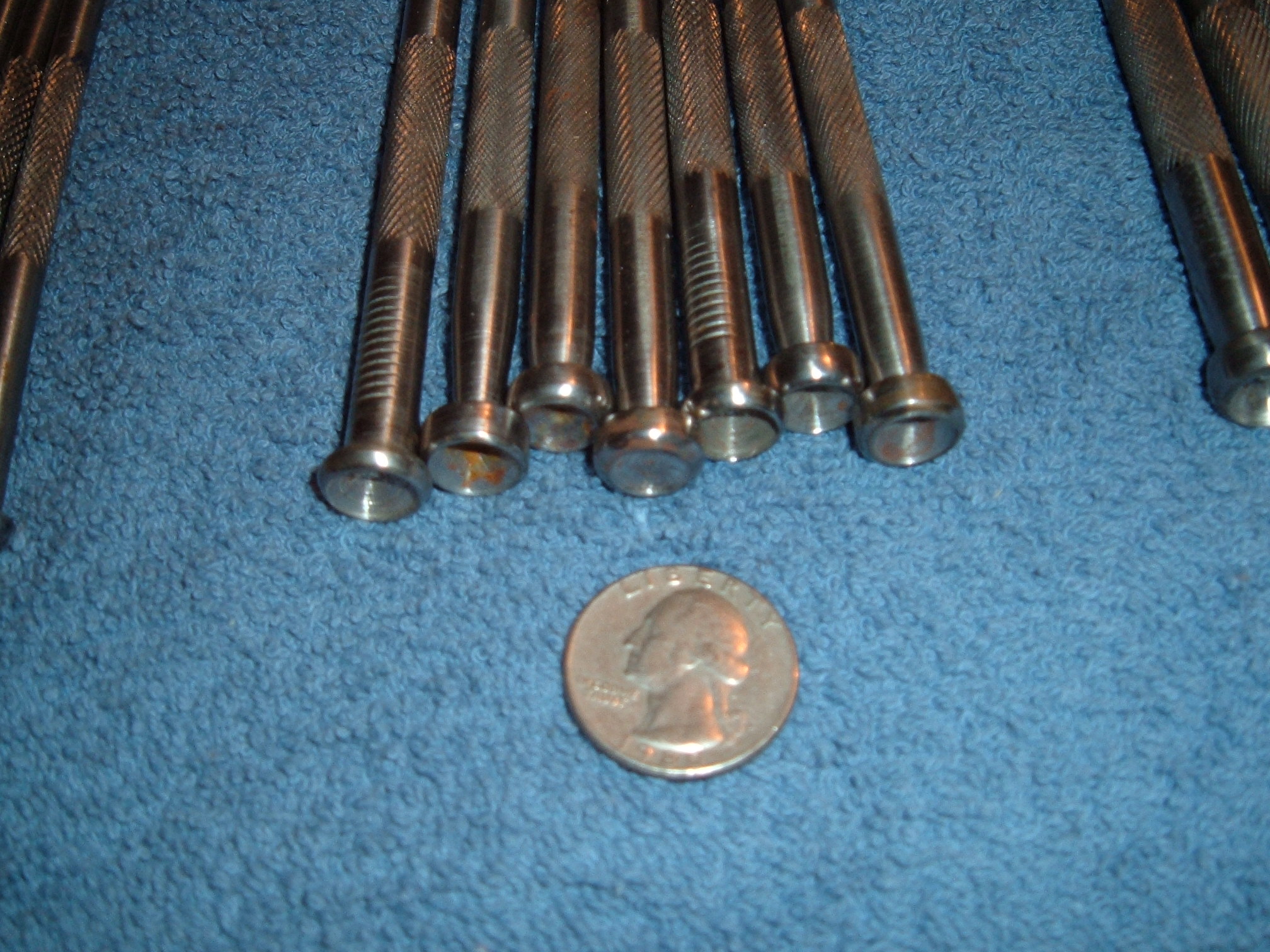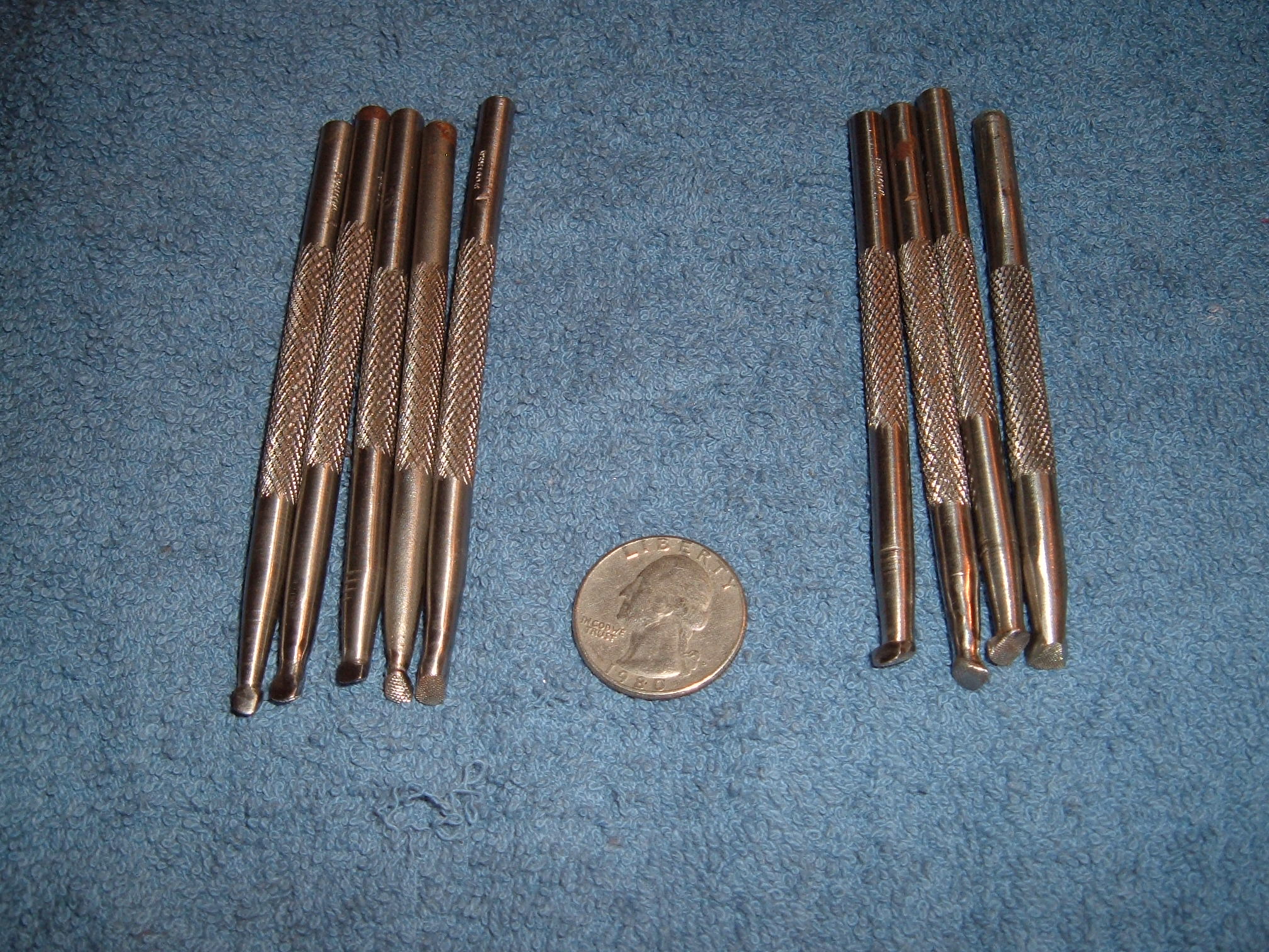 While I was organizing the tools and stuff that I got from Billy I found a box of what I thought was just bolts so I put it aside and forgot about it. I was looking for a smaller size bolt today so I opened the box. Much to my surprise and excitement I found nearly 70 stamps that Billy had made. They are older stamps made out of nails, and before he changed his stamp style. Some of them are a little crude and slightly dirty but they all work good and leave nice impressions. I would like to sell them because they are wasted if they sit on my shelf, but as I did not make them I feel uncomfortable selling them, so I am going to donate 50% of each sale to Cowboys for Cancer Research ( http://cowboysforcancerresearch.org ) This was a charity that Billy was very much involved with, he dontated a compleatly floral carved saddle to them. The stamps available are as follows, 15 small smooth flower centers, 14 medium smooth flower centers, 7 large smooth flower centers, 3 x-large smooth flower centers, 2 meduim lined flower centers, 2 large lined flower centers, 2 x-large lined flower centers, 3 medium smooth bevelers, 1 small smooth beveler, 2 smooth pointed bevelers, 1 lined pionted beveler, 2 checkered pointed bevelers, 4 large checkered bevelers, 4 medium checkered bevelers, and 5 small checkered bevelers. I am asking $30 each and $5 shipping for the first stamp and $0.50 each stamp after that. Pm me if you are interested. I have Paypal. First come first served.