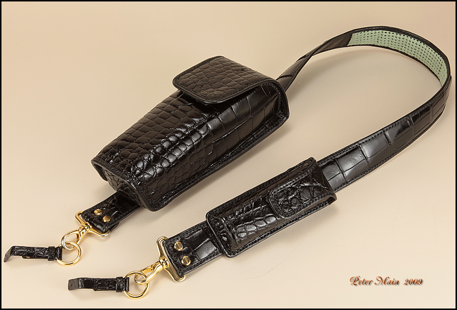 15. ..here is camera strap just completed. The strap and cases are all padded, lined with kangaroo and have bound edges (also in kangaroo)...all pieces are hand sewn. The strap is not straight, but is curved to make better contact with my shoulder. The closures on the cases are very strong velcro...did not want to trust magnets. One case is for a flash unit...the other for battery and cards. Peter