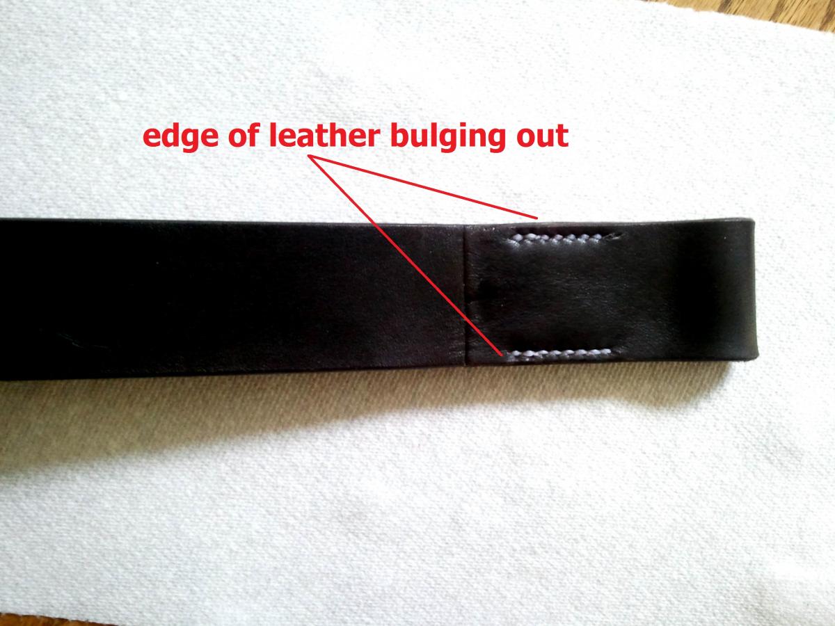 hi everyone, today I was practicing folding leather over itself and stitching through in preparation for making a halter.... I noticed that the leather along the stitched edges bulges out (please see picture) slightly from the rest of the strap that is not stitched..... Is there any remedy for this? I have tried tapping the edges back to flush with a hammer and it helped a little bit, but this method seems really crude... Any advice you could give me is greatly appreciated!!! Thank you in advance