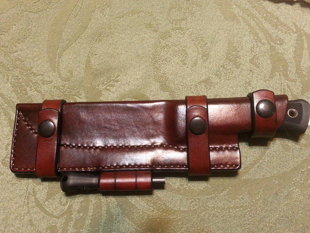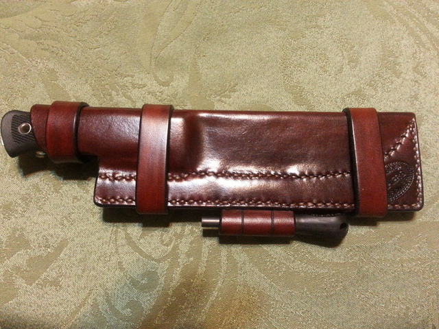 Malabar, I used 6-7 oz double shoulder from Tandy. The straps are held on with chicago screws. The strap to carry the knife vertical is held on with snaps. -