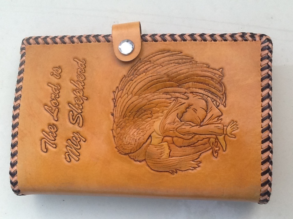 Here is a bible cover I've been working on for a customer. Hope to get it laced before I leave for an extended vacation. The angel is embossed .
