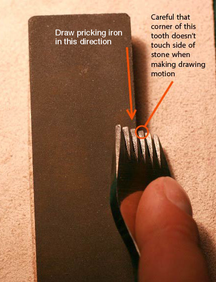 Thankyou fellas for all the suggestions! Sounds like I should give it a go then. I've sharpened plenty of chisels but this just seemed uncomfortably small to me. I have a little Fallkniven stone that would be good for this. I just noticed when laying the pricking iron with one tooth flat on the edge of the stone, that the tooth below rests very close to the side of the stone, so there's some danger of grinding the corner off of it if care isn't taken. Difficult to explain so I've attached a pic. Is this the correct way? Will give the wet&dry method a go too to see which feels more comfortable. Guess it's just a matter of personal preference. Nige - I'm sure another of your videos would be gratefully received by all the less experienced members of the forum. There's no substitute for seeing something done up close. Really appreciate all the time you've put into them! Ski - Cheers mate, I'm down south but kind of you to offer!